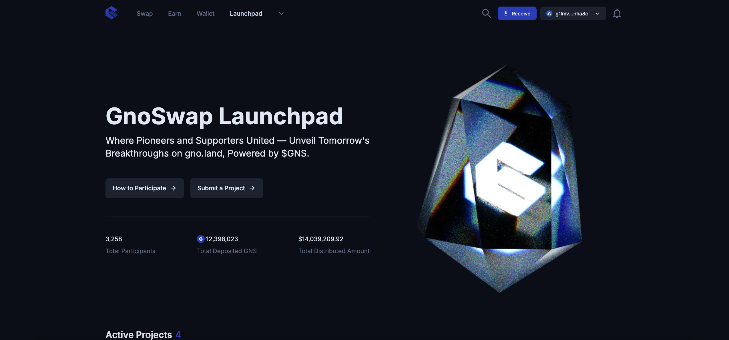 Scroll down to find a list of Active Projects. The list includes upcoming or ongoing projects on GnoSwap Launchpad. Click on a project of your choice to proceed.