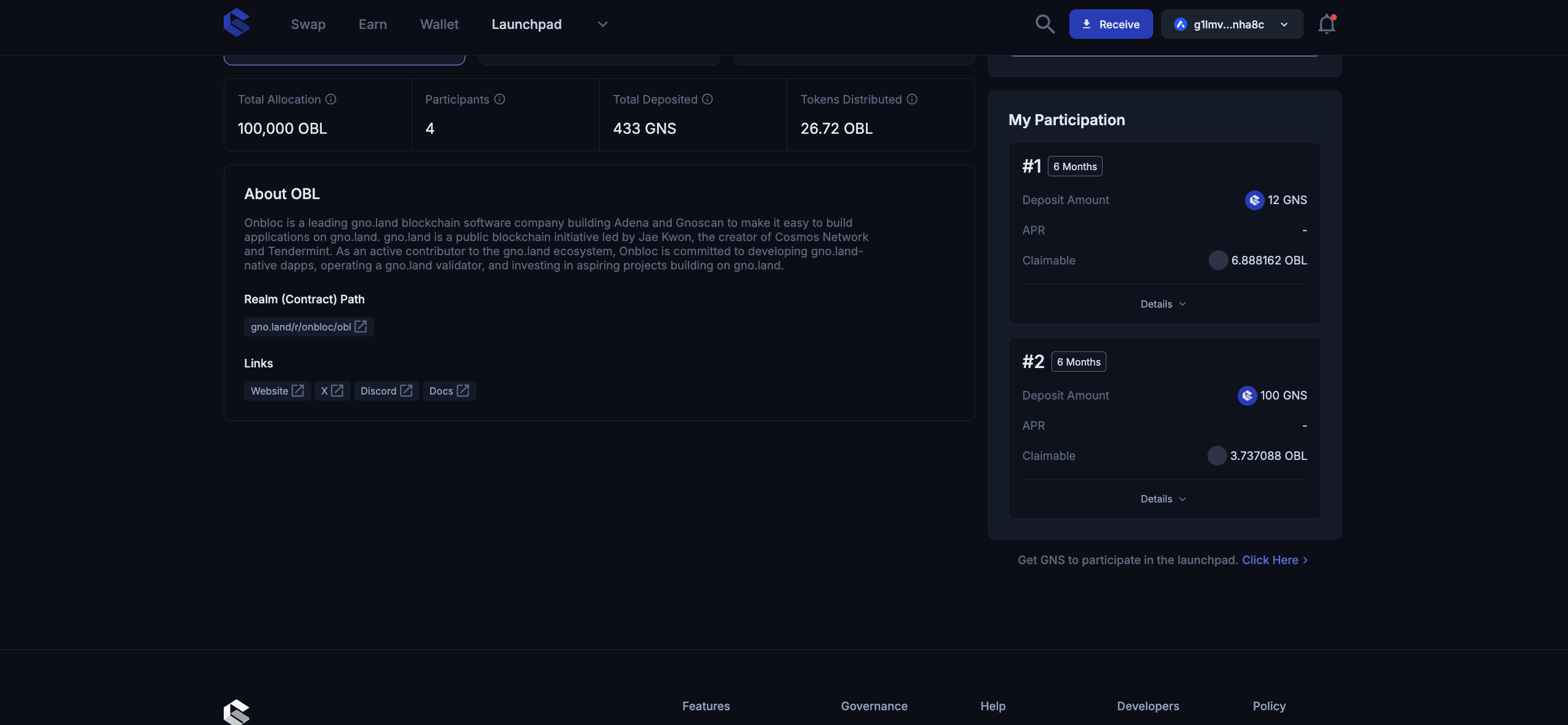 * The $GNS tokens you deposit are automatically staked to the [xGNS](https://docs.gnoswap.io/gnoswap-token/xgns) [Governance](https://docs.gnoswap.io/core-concepts/governance) Contract to start earning [Protocol Fee](https://docs.gnoswap.io/core-concepts/fees#protocol-fees) rewards, which are re-directed to the project owner.